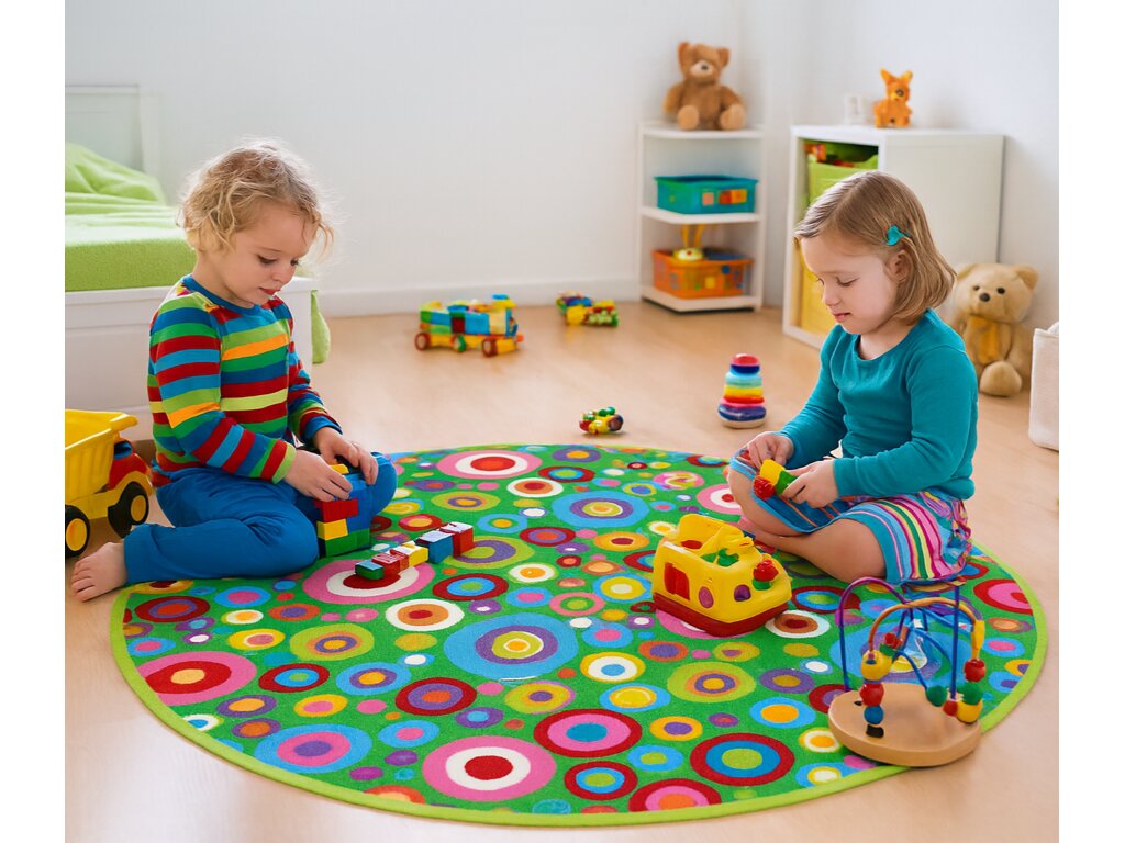 Kruhový kusový koberec Candy je originální v každém kuse, protože jej vyrábíme z metrážového koberce. Umíme variantu obdélníků i kruhů s obšitím. Obšití bývá zpravidla v jedné z barev obsažených v dezénu - může být červený, zelený, žlutý, vínový, modrý nebo i růžový. Kusovka Candy je bezpochyby veselý kruhový koberec plný barevných kruhů a hravých motivů. Základem je svěže zelené pozadí, na kterém jsou rozmístěny desítky spirál, puntíků a kroužků v jasných barvách, jako je červená, žlutá, modrá, růžová či oranžová. Koberec působí energicky, podporuje kreativitu a skvěle oživí každý dětský pokoj. Candy můžeme označit za ideální pro děti jako měkké a bezpečné místo na hraní, takže ani kolena těch nejmenších neutrpí při delším styku s povrchem. Dopřejte si radost a veselé barvy s naší kolečkovou Candy!